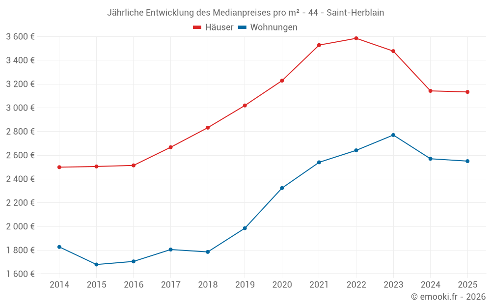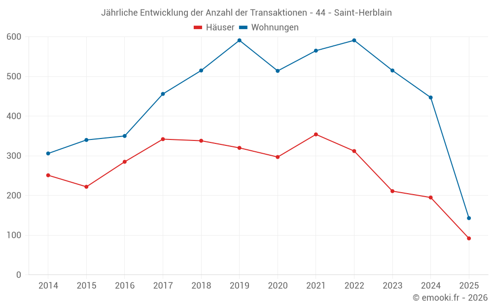 Der Durchschnittspreis auf den 92 Hausgeschäften der letzten 6 Monate in der Gemeinde Saint-Herblain betrug 3 134 € pro Quadratmeter für einen mittleren Immobilienwert von 281 550 €. Über diesen Zeitraum hinweg lagen 60% der Transaktionen zwischen 2 603 und 3 764 € pro Quadratmeter (vom 2. bis zum 8. Dezil).