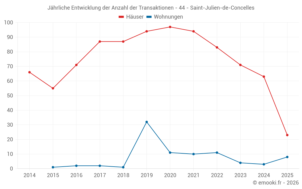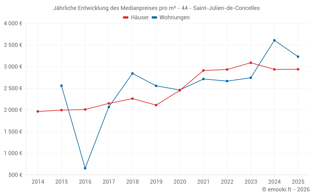 Der Durchschnittspreis auf den 23 Hausgeschäften der letzten 6 Monate in der Gemeinde Saint-Julien-de-Concelles betrug 2 941 € pro Quadratmeter für einen mittleren Immobilienwert von 270 000 €. Über diesen Zeitraum hinweg lagen 60% der Transaktionen zwischen 1 928 und 3 466 € pro Quadratmeter (vom 2. bis zum 8. Dezil).