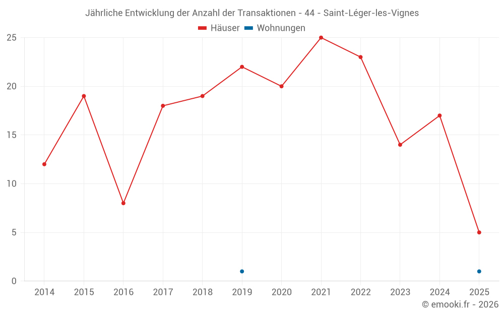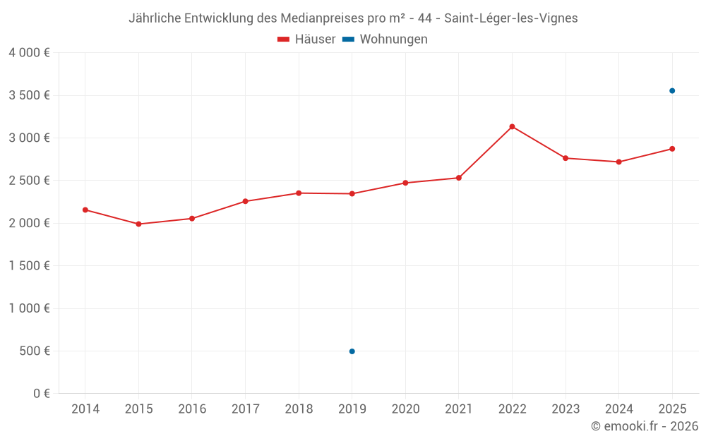 Der Durchschnittspreis auf den 20 Hausgeschäften der letzten 12 Monate in der Gemeinde Saint-Léger-les-Vignes betrug 2 782 € pro Quadratmeter für einen mittleren Immobilienwert von 305 000 €. Über diesen Zeitraum hinweg lagen 60% der Transaktionen zwischen 2 455 und 3 135 € pro Quadratmeter (vom 2. bis zum 8. Dezil).