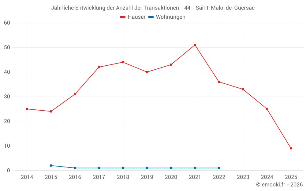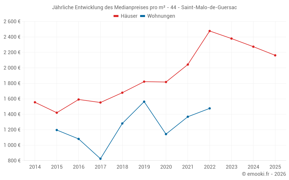 Der Durchschnittspreis auf den 25 Hausgeschäften der letzten 12 Monate in der Gemeinde Saint-Malo-de-Guersac betrug 2 198 € pro Quadratmeter für einen mittleren Immobilienwert von 215 000 €. Über diesen Zeitraum hinweg lagen 60% der Transaktionen zwischen 1 597 und 2 562 € pro Quadratmeter (vom 2. bis zum 8. Dezil).