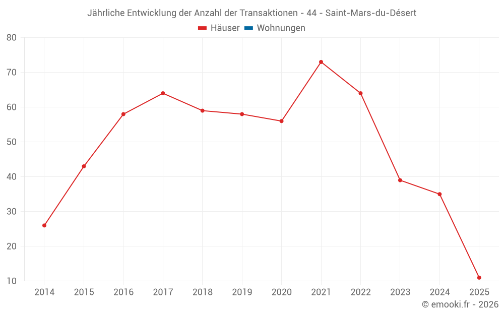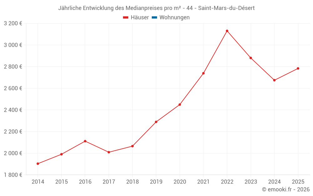 Der Durchschnittspreis auf den 36 Hausgeschäften der letzten 12 Monate in der Gemeinde Saint-Mars-du-Désert betrug 2 702 € pro Quadratmeter für einen mittleren Immobilienwert von 258 500 €. Über diesen Zeitraum hinweg lagen 60% der Transaktionen zwischen 2 341 und 3 059 € pro Quadratmeter (vom 2. bis zum 8. Dezil).