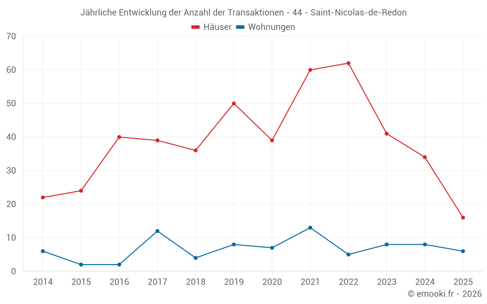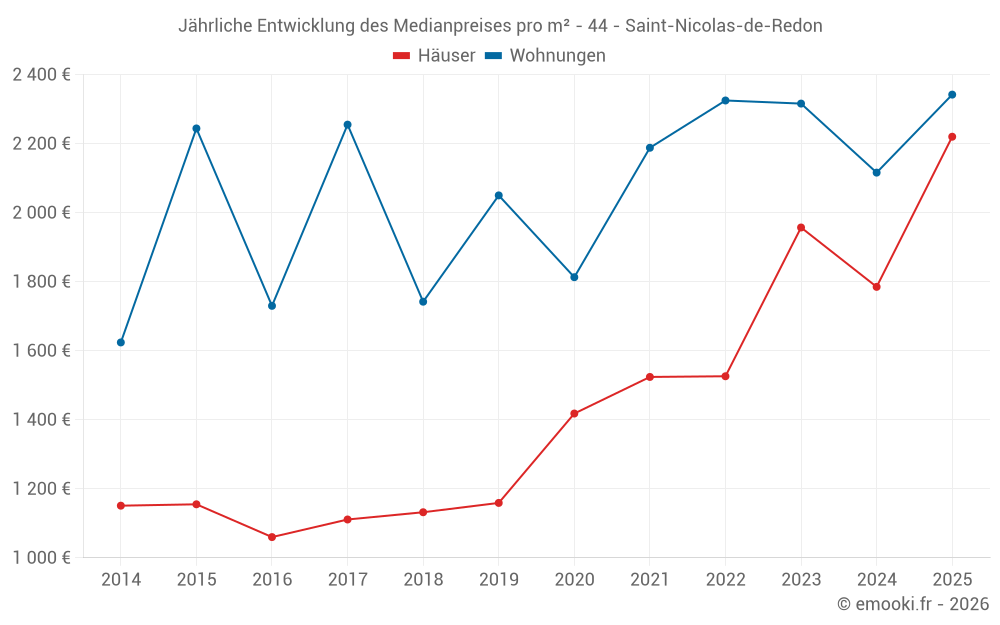 Der Durchschnittspreis auf den 19 Wohnungstransaktionen der letzten 24 Monate in der Gemeinde Saint-Nicolas-de-Redon betrug 2 171 € pro Quadratmeter für einen mittleren Immobilienwert von 104 306 €. Über diesen Zeitraum hinweg lagen 60% der Transaktionen zwischen 1 328 und 2 446 € pro Quadratmeter (vom 2. bis zum 8. Dezil).
