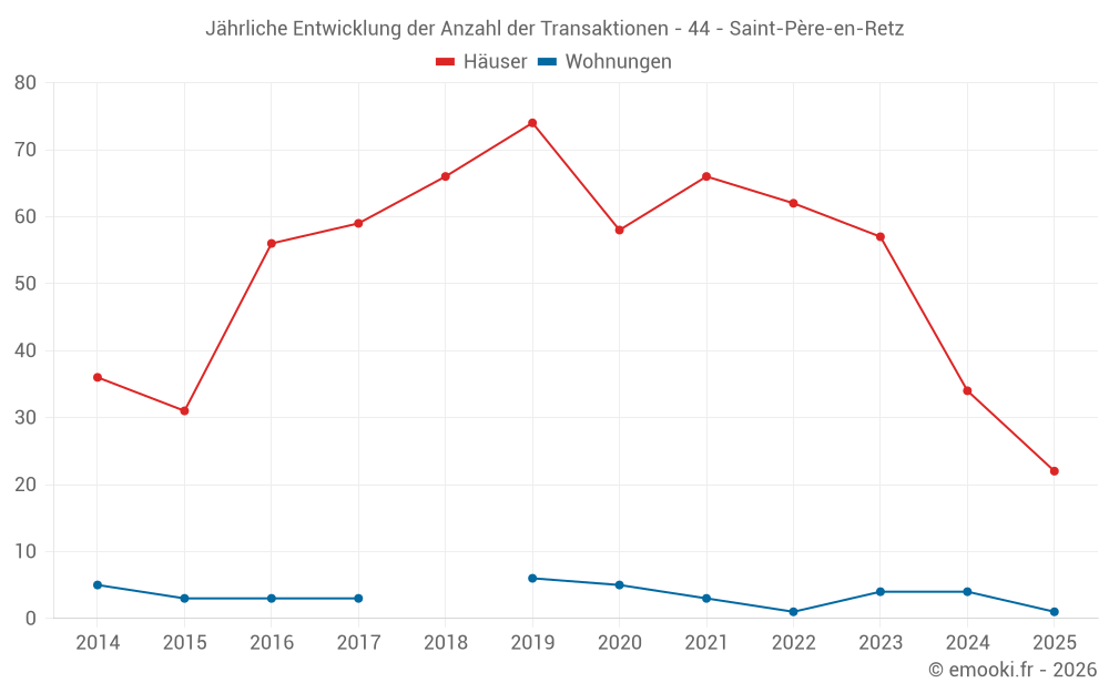 Der Durchschnittspreis auf den 22 Hausgeschäften der letzten 6 Monate in der Gemeinde Saint-Père-en-Retz betrug 2 824 € pro Quadratmeter für einen mittleren Immobilienwert von 246 000 €. Über diesen Zeitraum hinweg lagen 60% der Transaktionen zwischen 2 505 und 3 272 € pro Quadratmeter (vom 2. bis zum 8. Dezil).