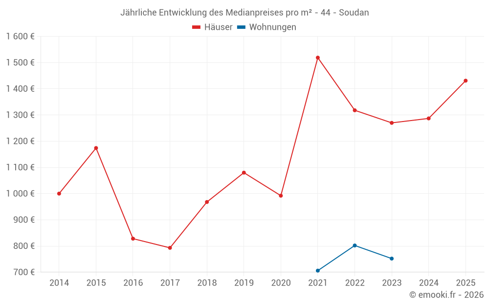 Der Durchschnittspreis auf den 28 Hausgeschäften der letzten 12 Monate in der Gemeinde Soudan betrug 1 339 € pro Quadratmeter für einen mittleren Immobilienwert von 113 000 €. Über diesen Zeitraum hinweg lagen 60% der Transaktionen zwischen 884 und 1 705 € pro Quadratmeter (vom 2. bis zum 8. Dezil).