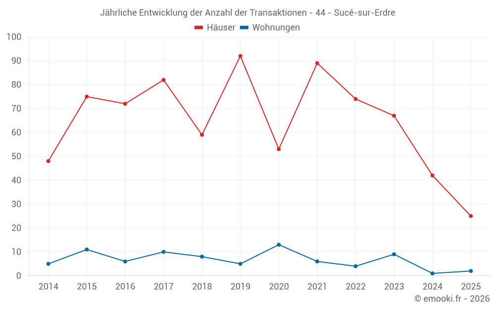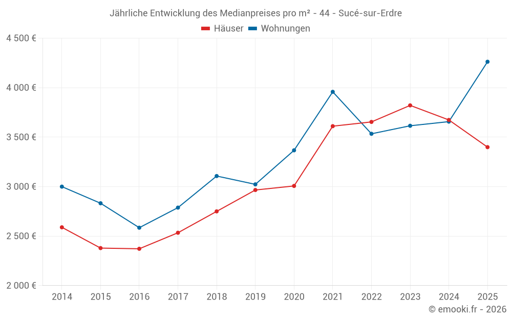 Der Durchschnittspreis auf den 25 Hausgeschäften der letzten 6 Monate in der Gemeinde Sucé-sur-Erdre betrug 3 399 € pro Quadratmeter für einen mittleren Immobilienwert von 382 500 €. Über diesen Zeitraum hinweg lagen 60% der Transaktionen zwischen 2 919 und 4 116 € pro Quadratmeter (vom 2. bis zum 8. Dezil).