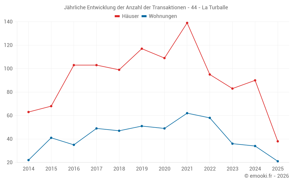 Der Durchschnittspreis auf den 38 Hausgeschäften der letzten 6 Monate in der Gemeinde La Turballe betrug 4 255 € pro Quadratmeter für einen mittleren Immobilienwert von 317 400 €. Über diesen Zeitraum hinweg lagen 60% der Transaktionen zwischen 2 982 und 5 509 € pro Quadratmeter (vom 2. bis zum 8. Dezil).