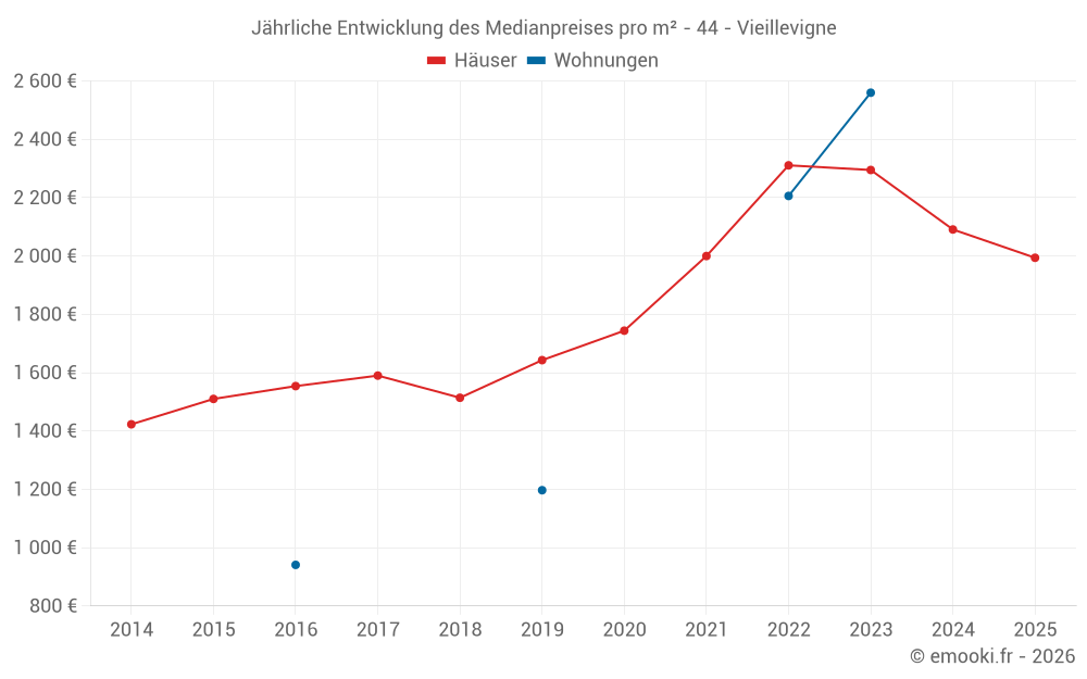 Der Durchschnittspreis auf den 45 Hausgeschäften der letzten 12 Monate in der Gemeinde Vieillevigne betrug 2 091 € pro Quadratmeter für einen mittleren Immobilienwert von 198 000 €. Über diesen Zeitraum hinweg lagen 60% der Transaktionen zwischen 1 677 und 2 803 € pro Quadratmeter (vom 2. bis zum 8. Dezil).