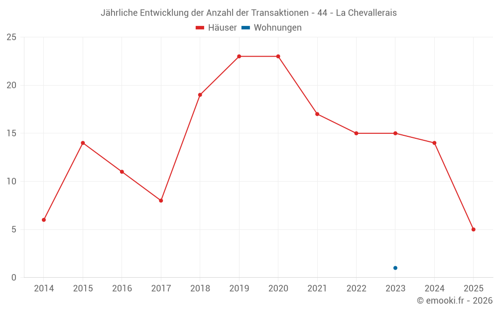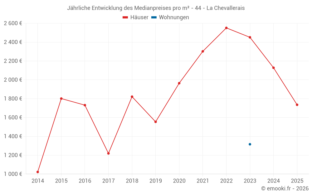 Der Durchschnittspreis auf den 29 Hausgeschäften der letzten 24 Monate in der Gemeinde La Chevallerais betrug 2 319 € pro Quadratmeter für einen mittleren Immobilienwert von 250 000 €. Über diesen Zeitraum hinweg lagen 60% der Transaktionen zwischen 1 699 und 2 907 € pro Quadratmeter (vom 2. bis zum 8. Dezil).