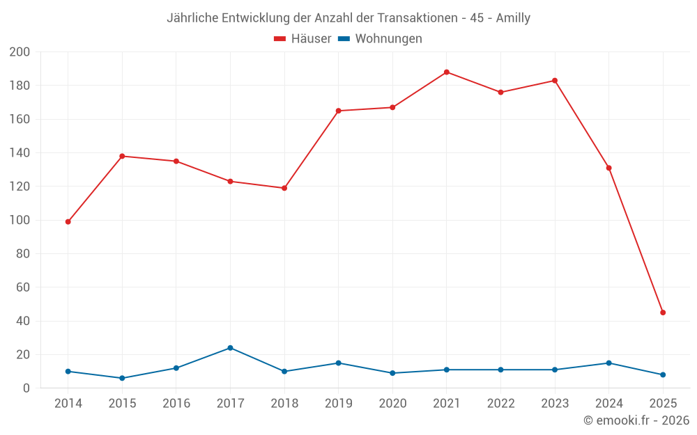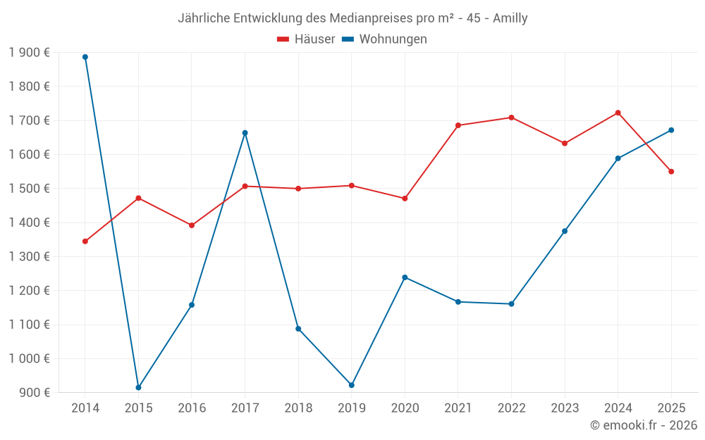 Der Durchschnittspreis auf den 45 Hausgeschäften der letzten 6 Monate in der Gemeinde Amilly betrug 1 550 € pro Quadratmeter für einen mittleren Immobilienwert von 125 000 €. Über diesen Zeitraum hinweg lagen 60% der Transaktionen zwischen 974 und 2 169 € pro Quadratmeter (vom 2. bis zum 8. Dezil).