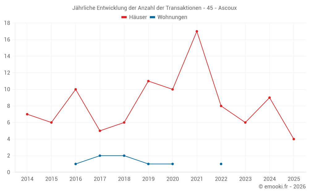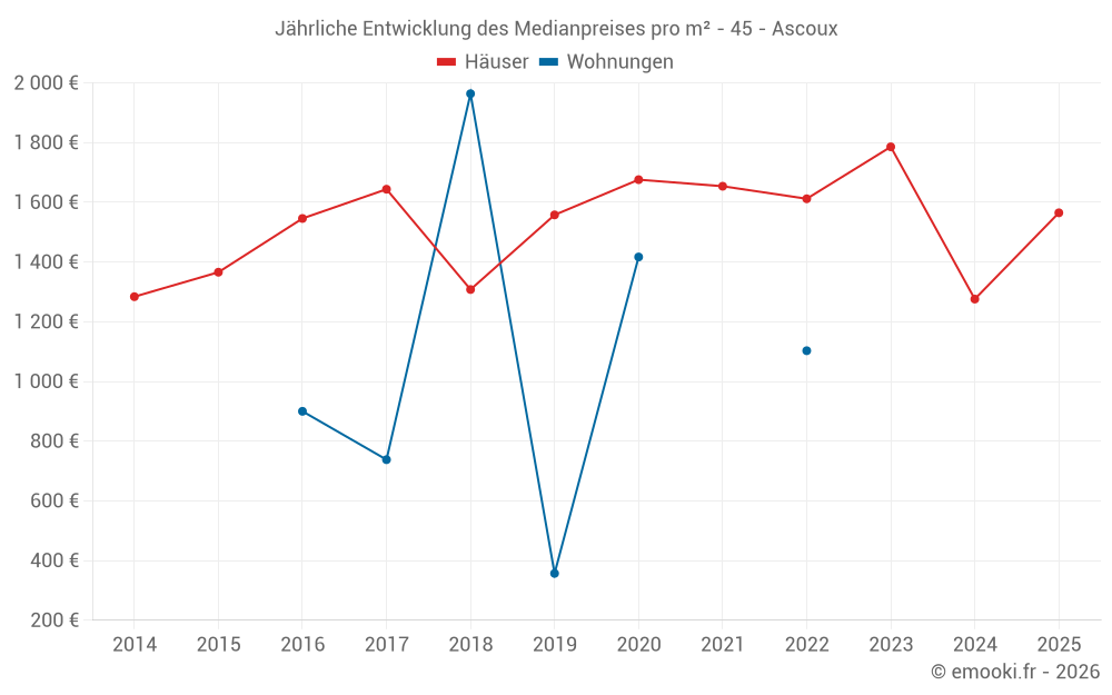 Der Durchschnittspreis auf den 18 Hausgeschäften der letzten 24 Monate in der Gemeinde Ascoux betrug 1 523 € pro Quadratmeter für einen mittleren Immobilienwert von 156 075 €. Über diesen Zeitraum hinweg lagen 60% der Transaktionen zwischen 1 029 und 1 802 € pro Quadratmeter (vom 2. bis zum 8. Dezil).