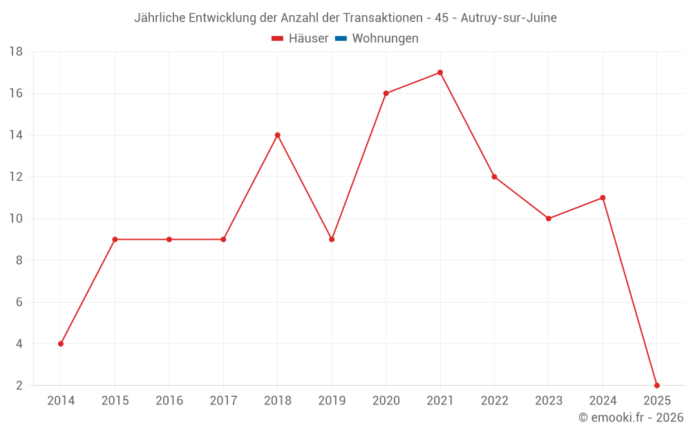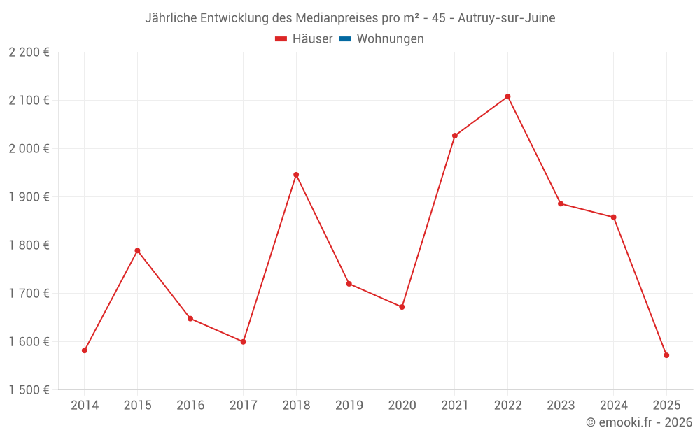 Der Durchschnittspreis auf den 19 Hausgeschäften der letzten 24 Monate in der Gemeinde Autruy-sur-Juine betrug 1 858 € pro Quadratmeter für einen mittleren Immobilienwert von 169 000 €. Über diesen Zeitraum hinweg lagen 60% der Transaktionen zwischen 1 363 und 2 267 € pro Quadratmeter (vom 2. bis zum 8. Dezil).