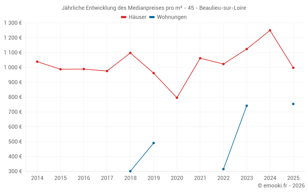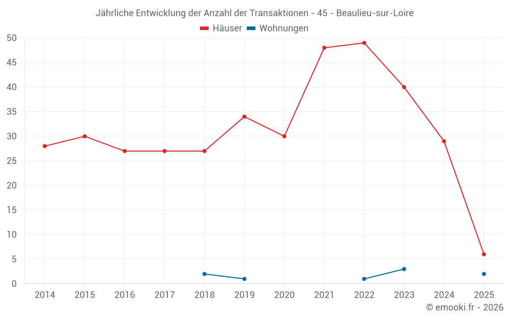 Der Durchschnittspreis auf den 23 Hausgeschäften der letzten 12 Monate in der Gemeinde Beaulieu-sur-Loire betrug 1 080 € pro Quadratmeter für einen mittleren Immobilienwert von 80 000 €. Über diesen Zeitraum hinweg lagen 60% der Transaktionen zwischen 844 und 1 467 € pro Quadratmeter (vom 2. bis zum 8. Dezil).