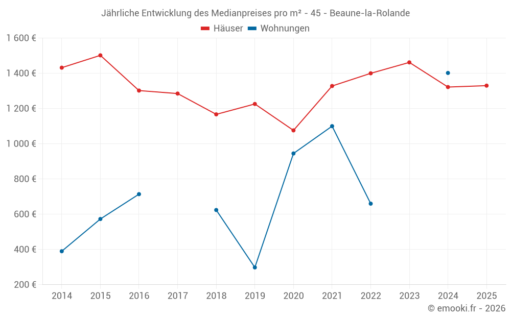 Der Durchschnittspreis auf den 26 Hausgeschäften der letzten 24 Monate in der Gemeinde Beaune-la-Rolande betrug 1 336 € pro Quadratmeter für einen mittleren Immobilienwert von 106 000 €. Über diesen Zeitraum hinweg lagen 60% der Transaktionen zwischen 700 und 1 849 € pro Quadratmeter (vom 2. bis zum 8. Dezil).