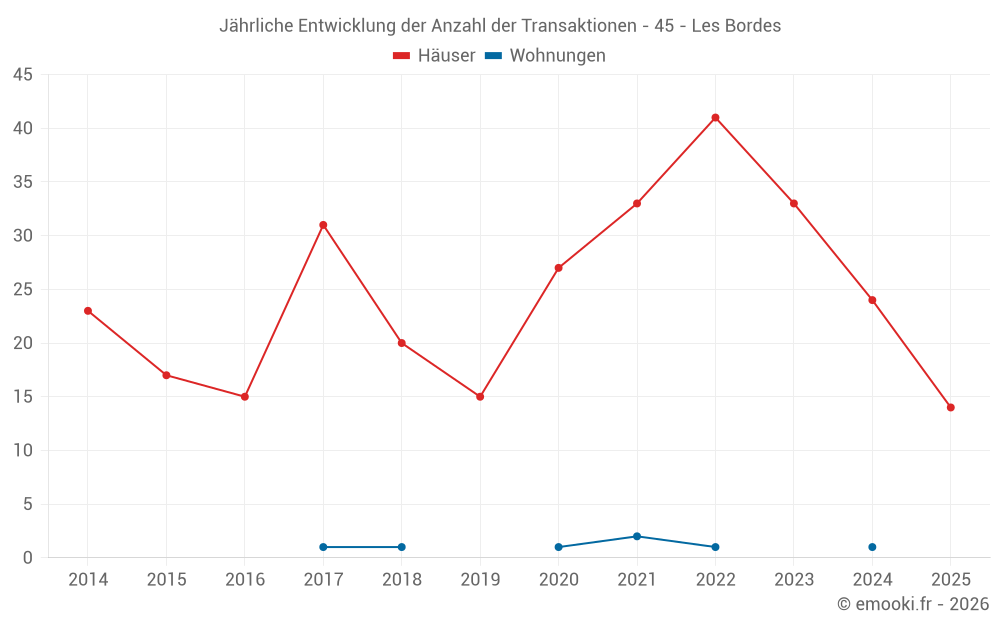 Der Durchschnittspreis auf den 30 Hausgeschäften der letzten 12 Monate in der Gemeinde Les Bordes betrug 1 515 € pro Quadratmeter für einen mittleren Immobilienwert von 135 375 €. Über diesen Zeitraum hinweg lagen 60% der Transaktionen zwischen 1 232 und 1 987 € pro Quadratmeter (vom 2. bis zum 8. Dezil).