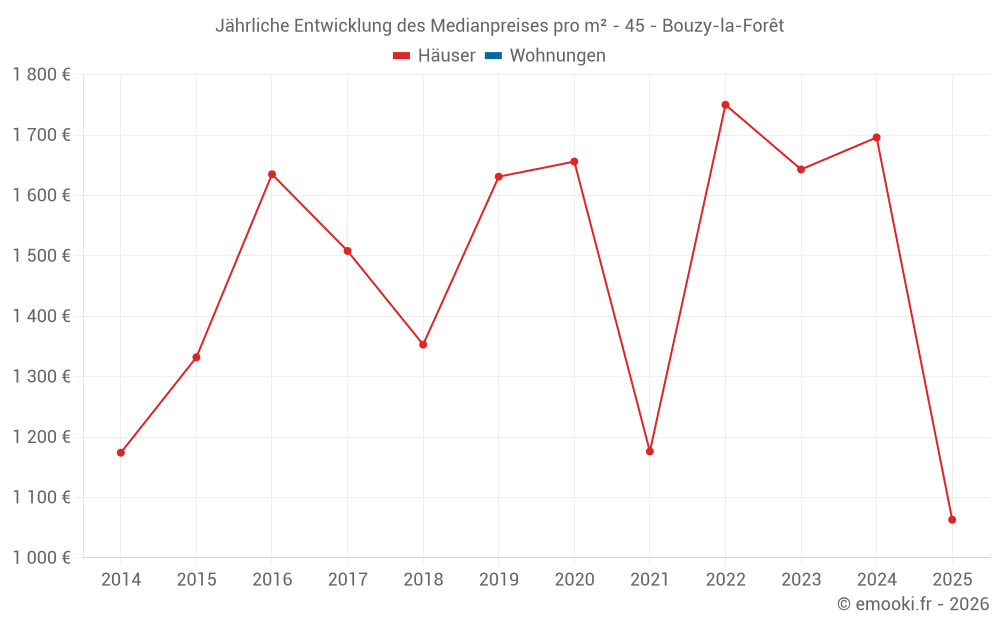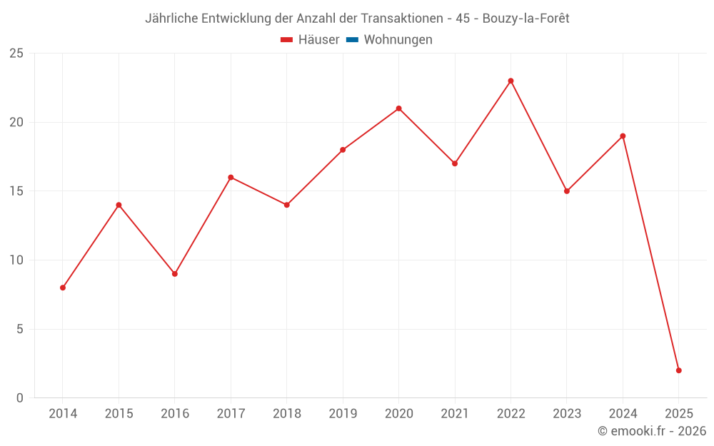 Der Durchschnittspreis auf den 29 Hausgeschäften der letzten 24 Monate in der Gemeinde Bouzy-la-Forêt betrug 1 696 € pro Quadratmeter für einen mittleren Immobilienwert von 170 000 €. Über diesen Zeitraum hinweg lagen 60% der Transaktionen zwischen 1 302 und 2 309 € pro Quadratmeter (vom 2. bis zum 8. Dezil).