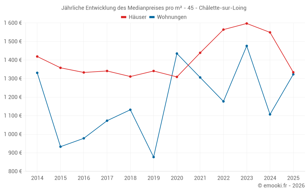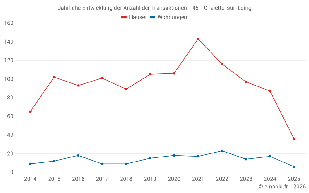 Der Durchschnittspreis auf den 36 Hausgeschäften der letzten 6 Monate in der Gemeinde Châlette-sur-Loing betrug 1 334 € pro Quadratmeter für einen mittleren Immobilienwert von 120 000 €. Über diesen Zeitraum hinweg lagen 60% der Transaktionen zwischen 1 078 und 1 770 € pro Quadratmeter (vom 2. bis zum 8. Dezil).