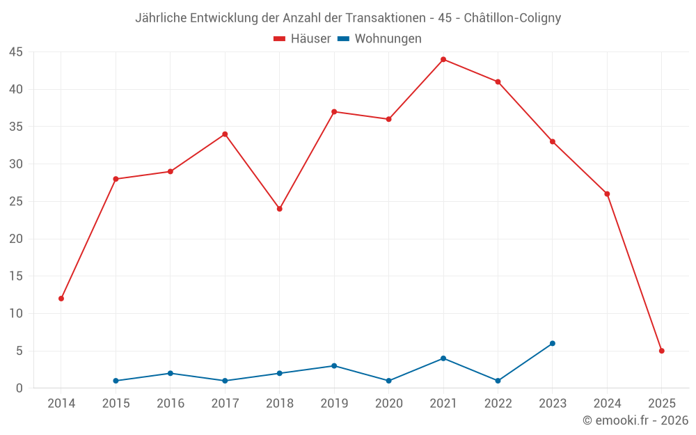 Der Durchschnittspreis auf den 22 Hausgeschäften der letzten 12 Monate in der Gemeinde Châtillon-Coligny betrug 754 € pro Quadratmeter für einen mittleren Immobilienwert von 67 500 €. Über diesen Zeitraum hinweg lagen 60% der Transaktionen zwischen 489 und 1 295 € pro Quadratmeter (vom 2. bis zum 8. Dezil).