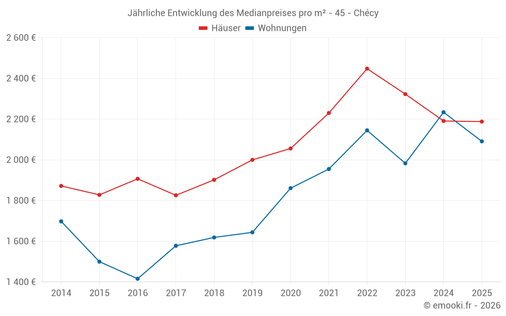 Der Durchschnittspreis auf den 15 Wohnungstransaktionen der letzten 24 Monate in der Gemeinde Chécy betrug 2 158 € pro Quadratmeter für einen mittleren Immobilienwert von 126 000 €. Über diesen Zeitraum hinweg lagen 60% der Transaktionen zwischen 1 913 und 2 326 € pro Quadratmeter (vom 2. bis zum 8. Dezil).