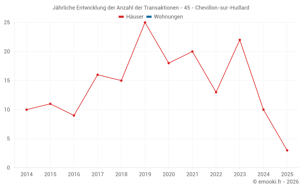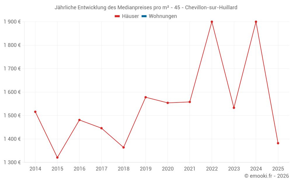 Der Durchschnittspreis auf den 21 Hausgeschäften der letzten 24 Monate in der Gemeinde Chevillon-sur-Huillard betrug 1 817 € pro Quadratmeter für einen mittleren Immobilienwert von 150 000 €. Über diesen Zeitraum hinweg lagen 60% der Transaktionen zwischen 972 und 2 121 € pro Quadratmeter (vom 2. bis zum 8. Dezil).