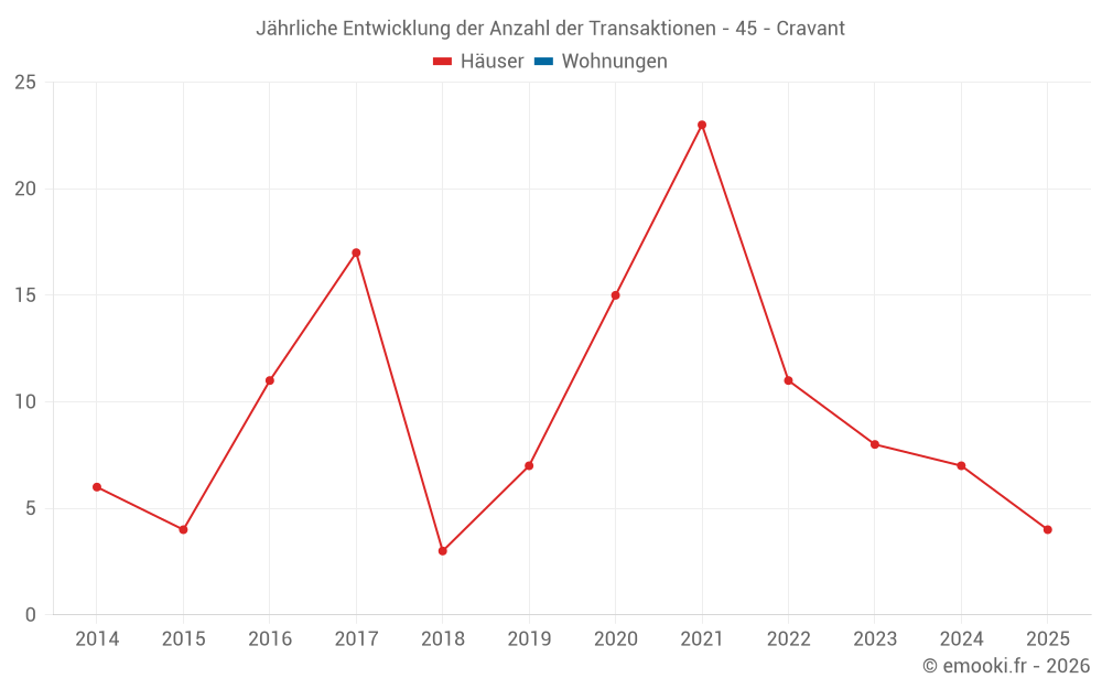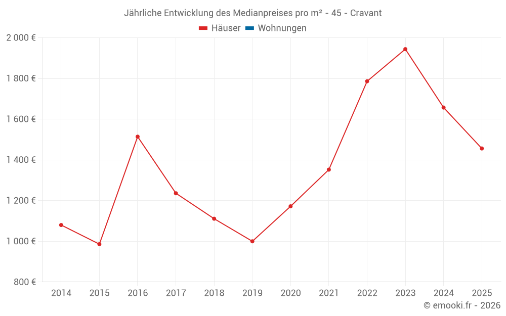 Der Durchschnittspreis auf den 15 Hausgeschäften der letzten 24 Monate in der Gemeinde Cravant betrug 1 509 € pro Quadratmeter für einen mittleren Immobilienwert von 173 000 €. Über diesen Zeitraum hinweg lagen 60% der Transaktionen zwischen 1 262 und 1 824 € pro Quadratmeter (vom 2. bis zum 8. Dezil).