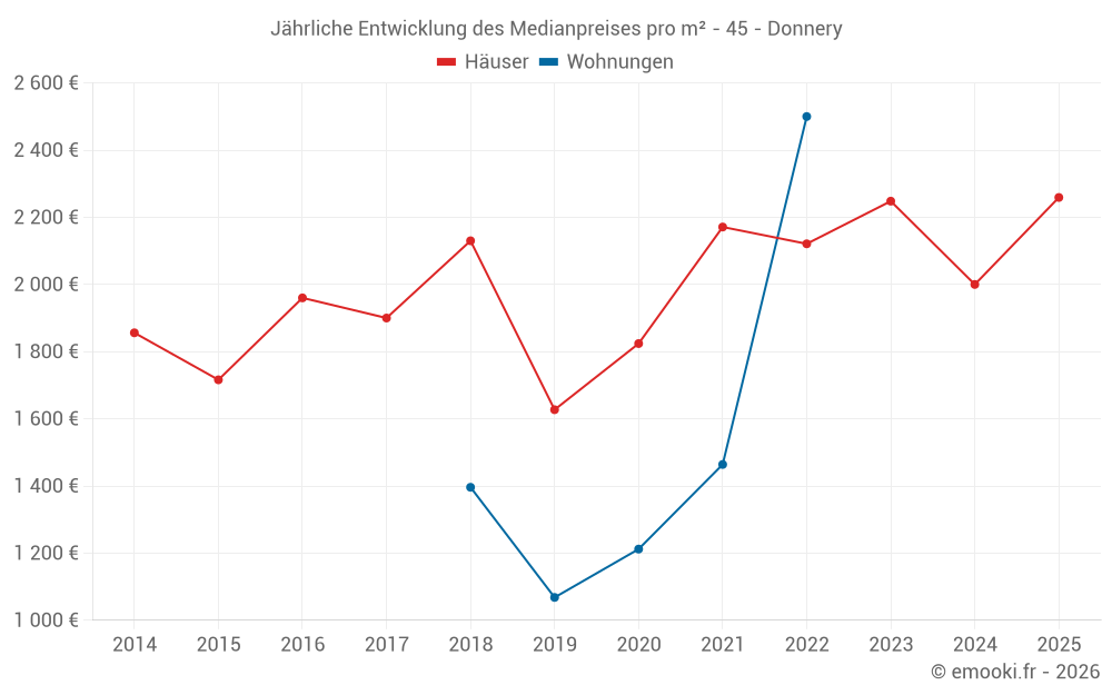 Der Durchschnittspreis auf den 23 Hausgeschäften der letzten 12 Monate in der Gemeinde Donnery betrug 1 980 € pro Quadratmeter für einen mittleren Immobilienwert von 189 300 €. Über diesen Zeitraum hinweg lagen 60% der Transaktionen zwischen 1 797 und 2 320 € pro Quadratmeter (vom 2. bis zum 8. Dezil).