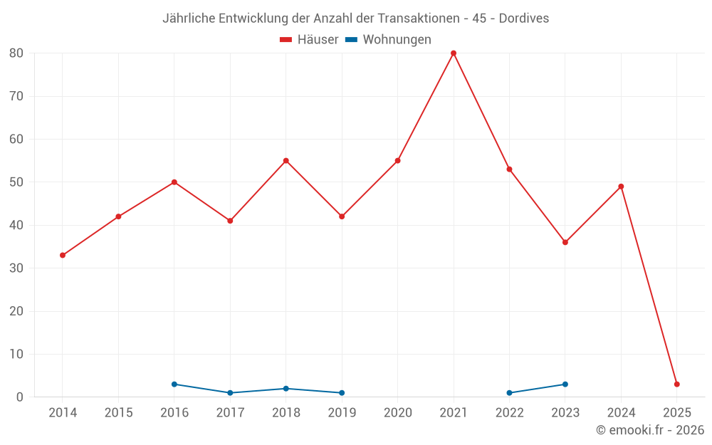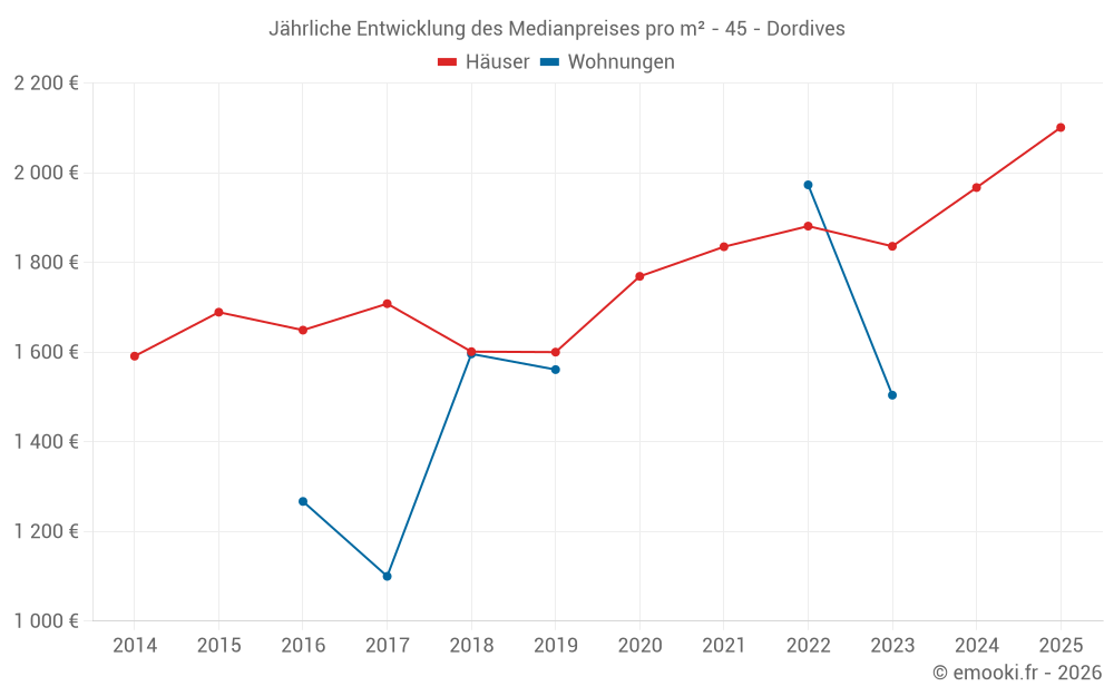 Der Durchschnittspreis auf den 30 Hausgeschäften der letzten 12 Monate in der Gemeinde Dordives betrug 2 012 € pro Quadratmeter für einen mittleren Immobilienwert von 161 500 €. Über diesen Zeitraum hinweg lagen 60% der Transaktionen zwischen 1 510 und 2 356 € pro Quadratmeter (vom 2. bis zum 8. Dezil).