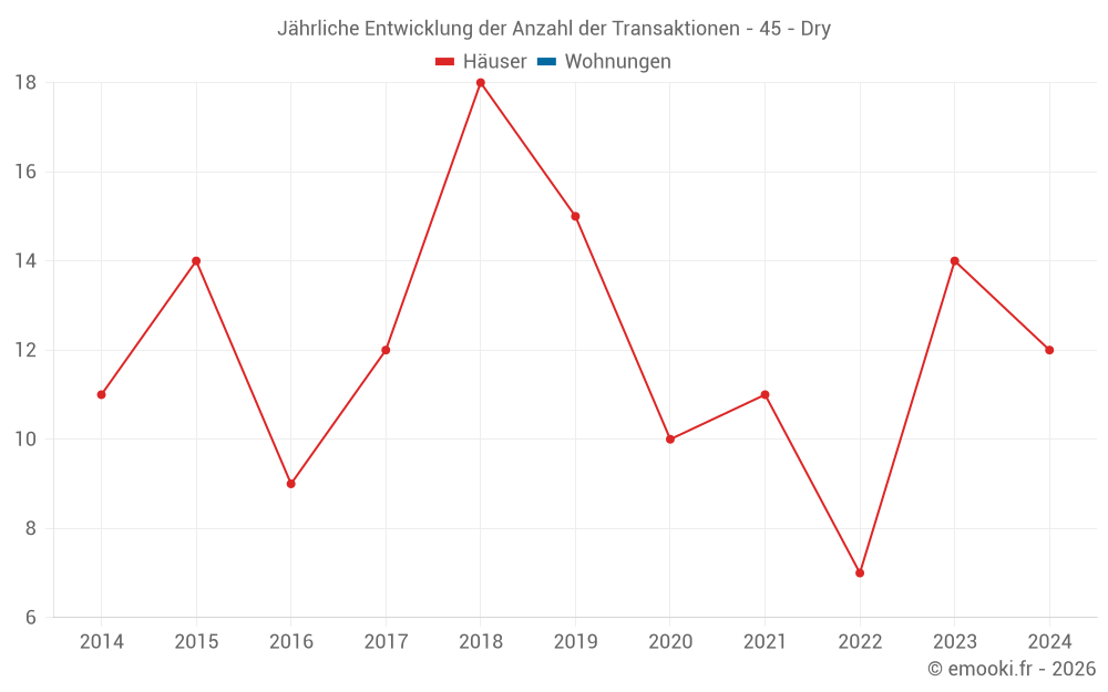 Der Durchschnittspreis auf den 19 Hausgeschäften der letzten 24 Monate in der Gemeinde Dry betrug 2 111 € pro Quadratmeter für einen mittleren Immobilienwert von 222 000 €. Über diesen Zeitraum hinweg lagen 60% der Transaktionen zwischen 1 667 und 2 901 € pro Quadratmeter (vom 2. bis zum 8. Dezil).