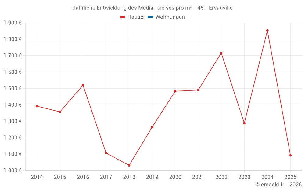 Der Durchschnittspreis auf den 15 Hausgeschäften der letzten 24 Monate in der Gemeinde Ervauville betrug 1 654 € pro Quadratmeter für einen mittleren Immobilienwert von 142 000 €. Über diesen Zeitraum hinweg lagen 60% der Transaktionen zwischen 936 und 1 894 € pro Quadratmeter (vom 2. bis zum 8. Dezil).