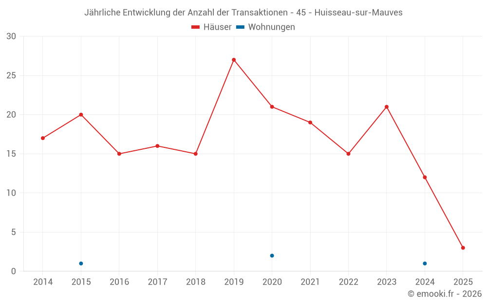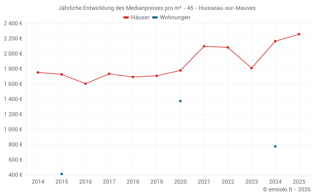 Der Durchschnittspreis auf den 29 Hausgeschäften der letzten 24 Monate in der Gemeinde Huisseau-sur-Mauves betrug 2 112 € pro Quadratmeter für einen mittleren Immobilienwert von 200 000 €. Über diesen Zeitraum hinweg lagen 60% der Transaktionen zwischen 1 683 und 2 408 € pro Quadratmeter (vom 2. bis zum 8. Dezil).
