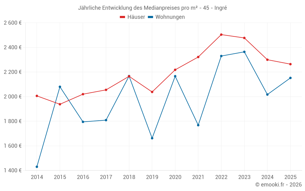 Der Durchschnittspreis auf den 27 Hausgeschäften der letzten 6 Monate in der Gemeinde Ingré betrug 2 264 € pro Quadratmeter für einen mittleren Immobilienwert von 245 000 €. Über diesen Zeitraum hinweg lagen 60% der Transaktionen zwischen 1 900 und 2 570 € pro Quadratmeter (vom 2. bis zum 8. Dezil).