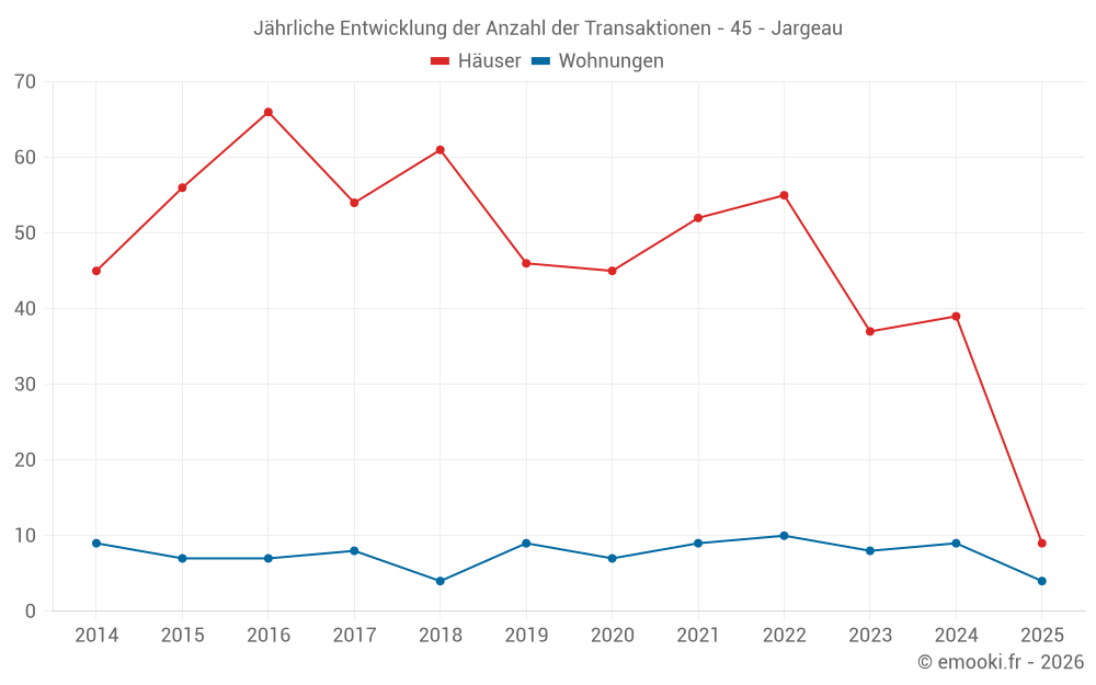 Der Durchschnittspreis auf den 19 Wohnungstransaktionen der letzten 24 Monate in der Gemeinde Jargeau betrug 1 700 € pro Quadratmeter für einen mittleren Immobilienwert von 95 000 €. Über diesen Zeitraum hinweg lagen 60% der Transaktionen zwischen 1 314 und 2 030 € pro Quadratmeter (vom 2. bis zum 8. Dezil).