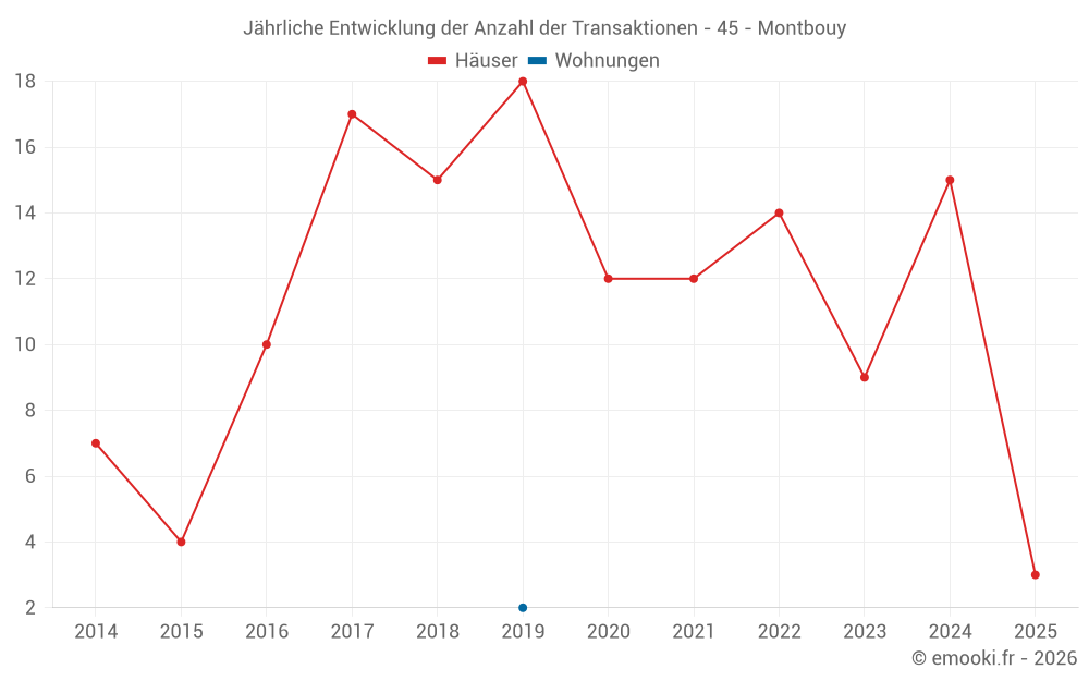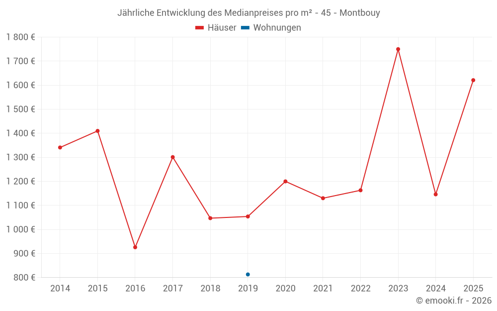 Der Durchschnittspreis auf den 25 Hausgeschäften der letzten 24 Monate in der Gemeinde Montbouy betrug 1 313 € pro Quadratmeter für einen mittleren Immobilienwert von 103 080 €. Über diesen Zeitraum hinweg lagen 60% der Transaktionen zwischen 689 und 1 833 € pro Quadratmeter (vom 2. bis zum 8. Dezil).