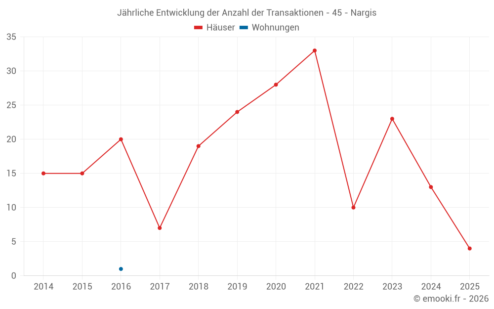 Der Durchschnittspreis auf den 25 Hausgeschäften der letzten 24 Monate in der Gemeinde Nargis betrug 1 629 € pro Quadratmeter für einen mittleren Immobilienwert von 159 000 €. Über diesen Zeitraum hinweg lagen 60% der Transaktionen zwischen 1 264 und 2 105 € pro Quadratmeter (vom 2. bis zum 8. Dezil).