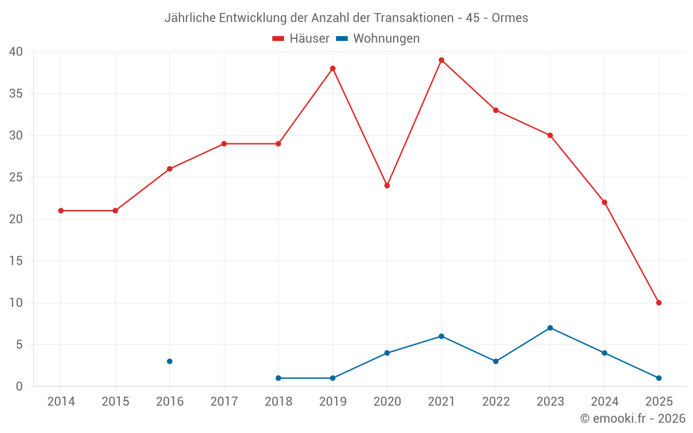 Der Durchschnittspreis auf den 24 Hausgeschäften der letzten 12 Monate in der Gemeinde Ormes betrug 2 397 € pro Quadratmeter für einen mittleren Immobilienwert von 242 200 €. Über diesen Zeitraum hinweg lagen 60% der Transaktionen zwischen 2 160 und 3 021 € pro Quadratmeter (vom 2. bis zum 8. Dezil).