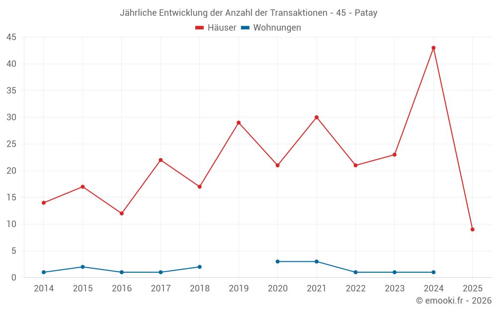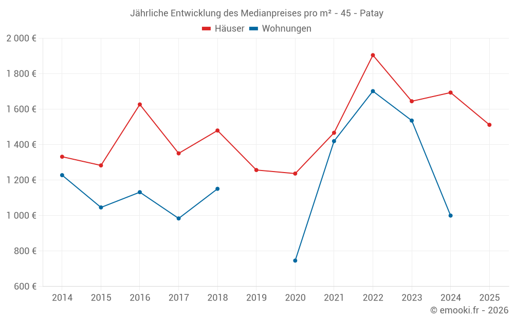 Der Durchschnittspreis auf den 37 Hausgeschäften der letzten 12 Monate in der Gemeinde Patay betrug 1 696 € pro Quadratmeter für einen mittleren Immobilienwert von 168 000 €. Über diesen Zeitraum hinweg lagen 60% der Transaktionen zwischen 1 263 und 2 137 € pro Quadratmeter (vom 2. bis zum 8. Dezil).