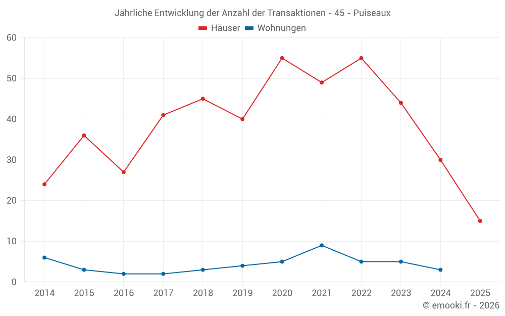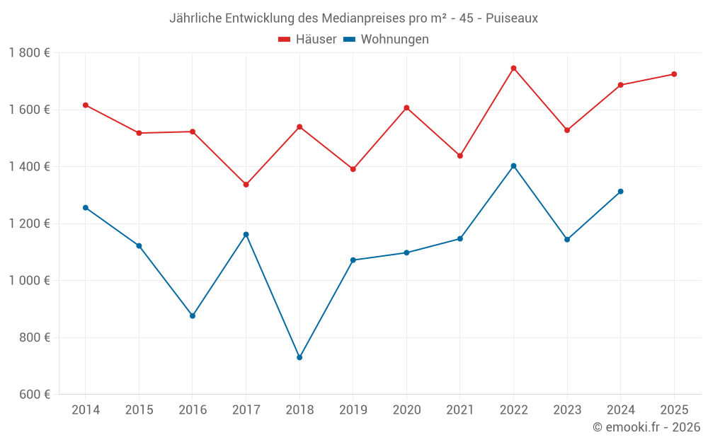 Der Durchschnittspreis auf den 36 Hausgeschäften der letzten 12 Monate in der Gemeinde Puiseaux betrug 1 687 € pro Quadratmeter für einen mittleren Immobilienwert von 137 500 €. Über diesen Zeitraum hinweg lagen 60% der Transaktionen zwischen 1 051 und 2 149 € pro Quadratmeter (vom 2. bis zum 8. Dezil).