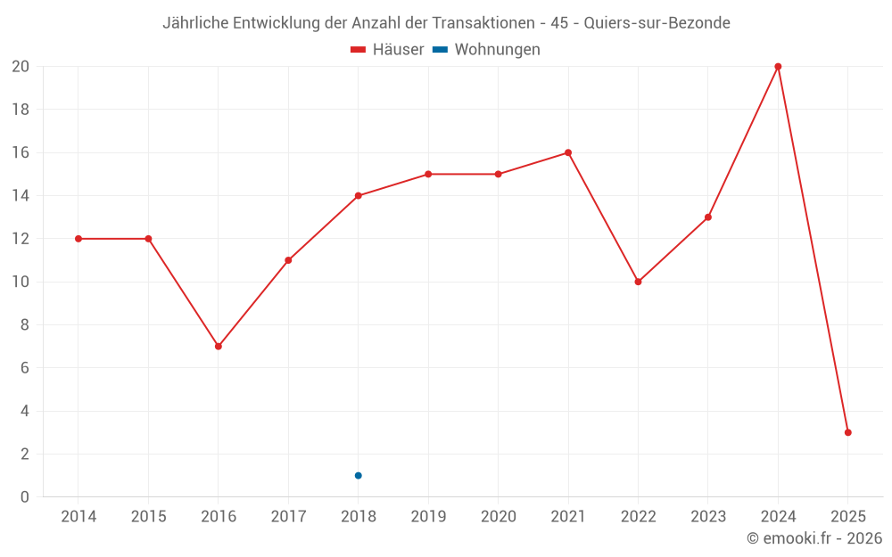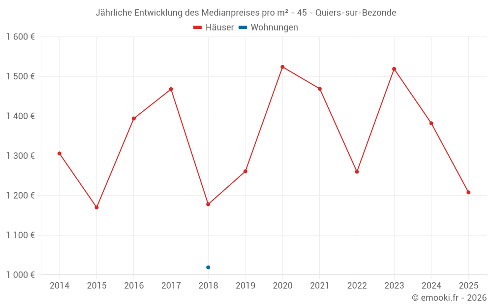 Der Durchschnittspreis auf den 25 Hausgeschäften der letzten 24 Monate in der Gemeinde Quiers-sur-Bezonde betrug 1 311 € pro Quadratmeter für einen mittleren Immobilienwert von 128 000 €. Über diesen Zeitraum hinweg lagen 60% der Transaktionen zwischen 1 001 und 1 709 € pro Quadratmeter (vom 2. bis zum 8. Dezil).