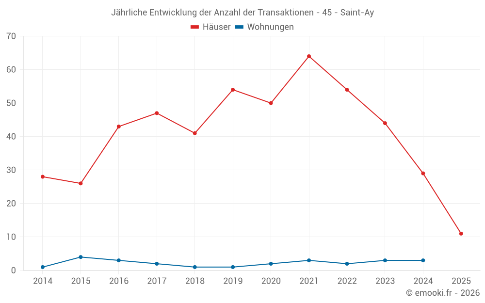 Der Durchschnittspreis auf den 30 Hausgeschäften der letzten 12 Monate in der Gemeinde Saint-Ay betrug 1 962 € pro Quadratmeter für einen mittleren Immobilienwert von 190 875 €. Über diesen Zeitraum hinweg lagen 60% der Transaktionen zwischen 1 373 und 2 373 € pro Quadratmeter (vom 2. bis zum 8. Dezil).