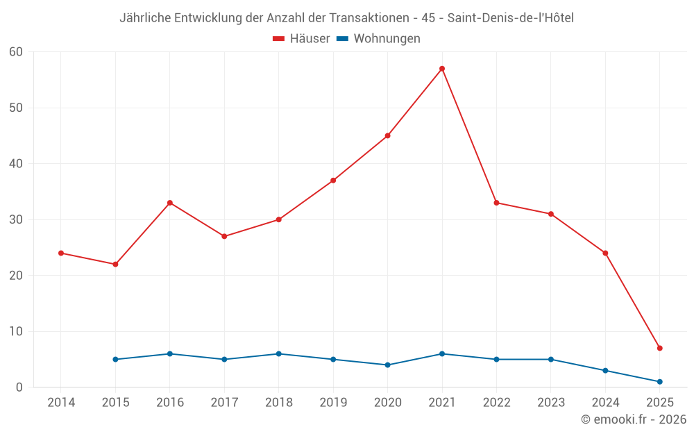 Der Durchschnittspreis auf den 21 Hausgeschäften der letzten 12 Monate in der Gemeinde Saint-Denis-de-l'Hôtel betrug 2 141 € pro Quadratmeter für einen mittleren Immobilienwert von 205 500 €. Über diesen Zeitraum hinweg lagen 60% der Transaktionen zwischen 1 800 und 3 289 € pro Quadratmeter (vom 2. bis zum 8. Dezil).