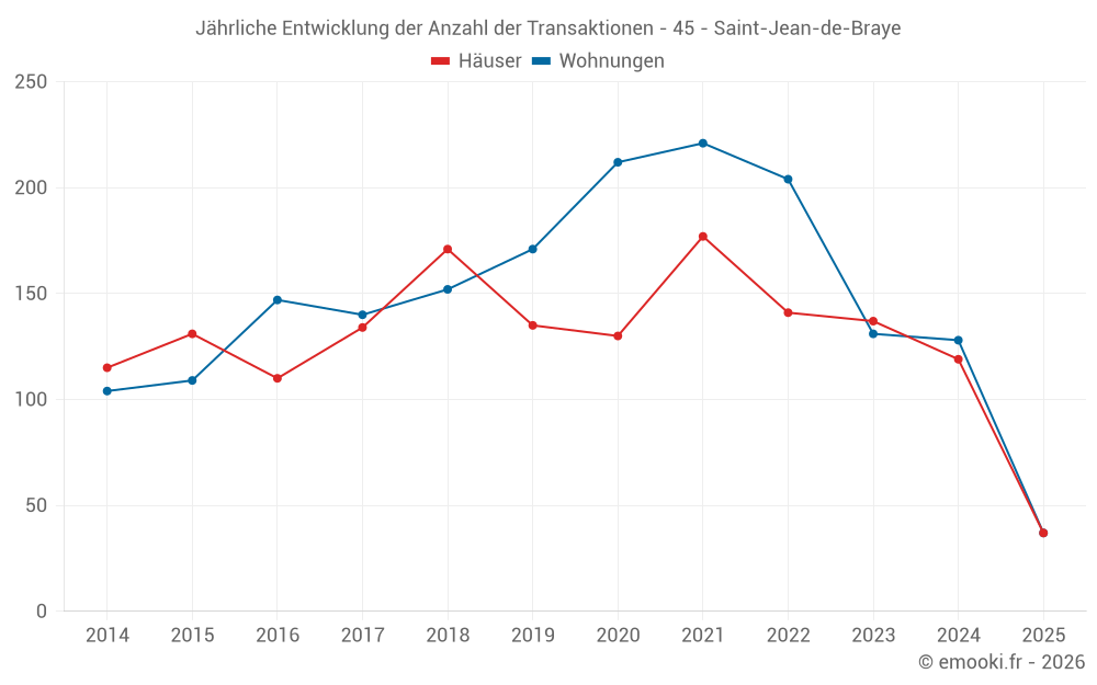 Der Durchschnittspreis auf den 37 Hausgeschäften der letzten 6 Monate in der Gemeinde Saint-Jean-de-Braye betrug 2 359 € pro Quadratmeter für einen mittleren Immobilienwert von 223 000 €. Über diesen Zeitraum hinweg lagen 60% der Transaktionen zwischen 2 007 und 2 688 € pro Quadratmeter (vom 2. bis zum 8. Dezil).