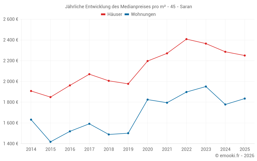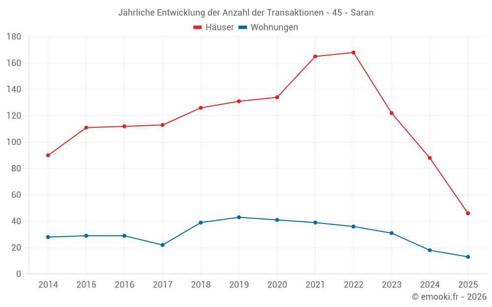 Der Durchschnittspreis auf den 46 Hausgeschäften der letzten 6 Monate in der Gemeinde Saran betrug 2 250 € pro Quadratmeter für einen mittleren Immobilienwert von 203 900 €. Über diesen Zeitraum hinweg lagen 60% der Transaktionen zwischen 1 528 und 2 743 € pro Quadratmeter (vom 2. bis zum 8. Dezil).