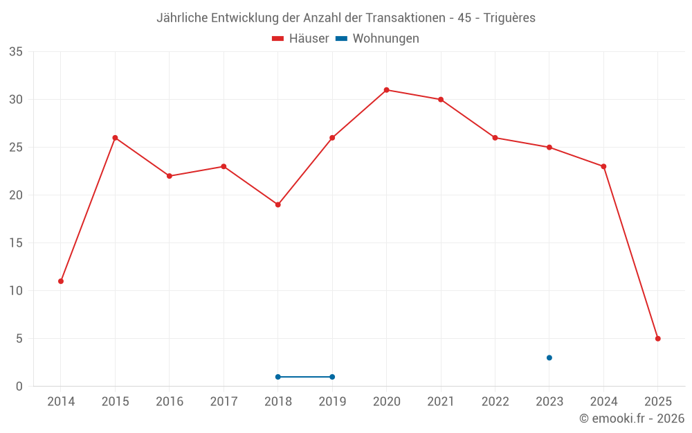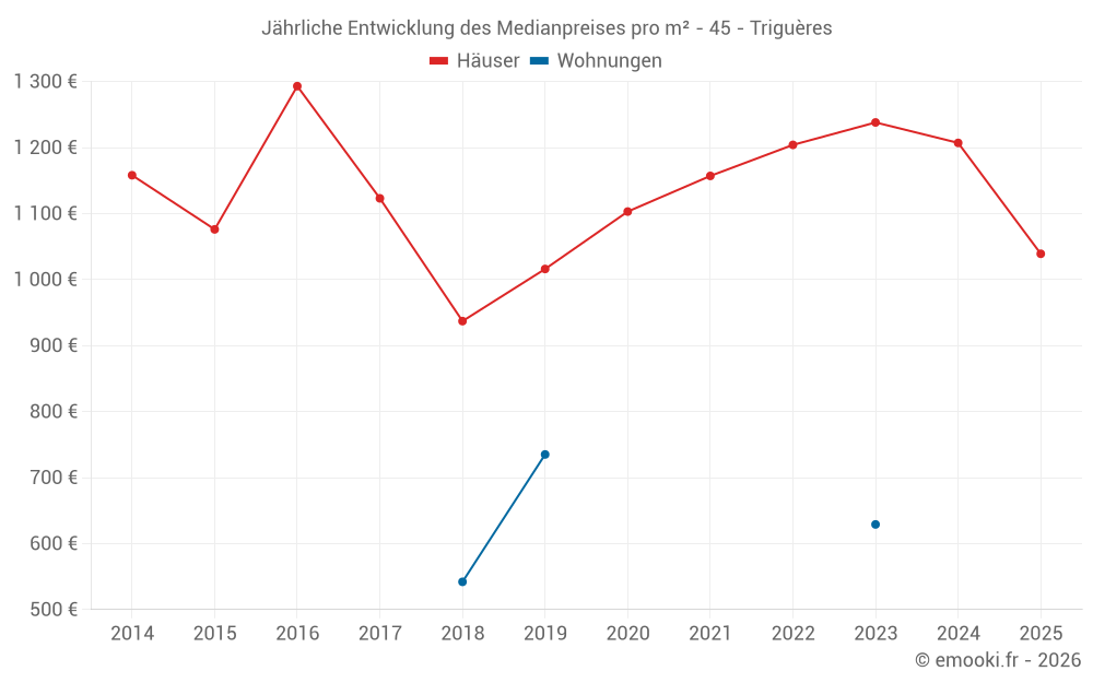 Der Durchschnittspreis auf den 38 Hausgeschäften der letzten 24 Monate in der Gemeinde Triguères betrug 1 232 € pro Quadratmeter für einen mittleren Immobilienwert von 85 750 €. Über diesen Zeitraum hinweg lagen 60% der Transaktionen zwischen 755 und 1 736 € pro Quadratmeter (vom 2. bis zum 8. Dezil).