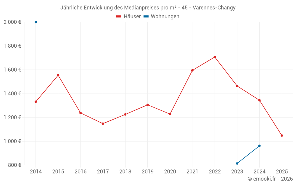 Der Durchschnittspreis auf den 40 Hausgeschäften der letzten 24 Monate in der Gemeinde Varennes-Changy betrug 1 430 € pro Quadratmeter für einen mittleren Immobilienwert von 125 000 €. Über diesen Zeitraum hinweg lagen 60% der Transaktionen zwischen 976 und 1 993 € pro Quadratmeter (vom 2. bis zum 8. Dezil).