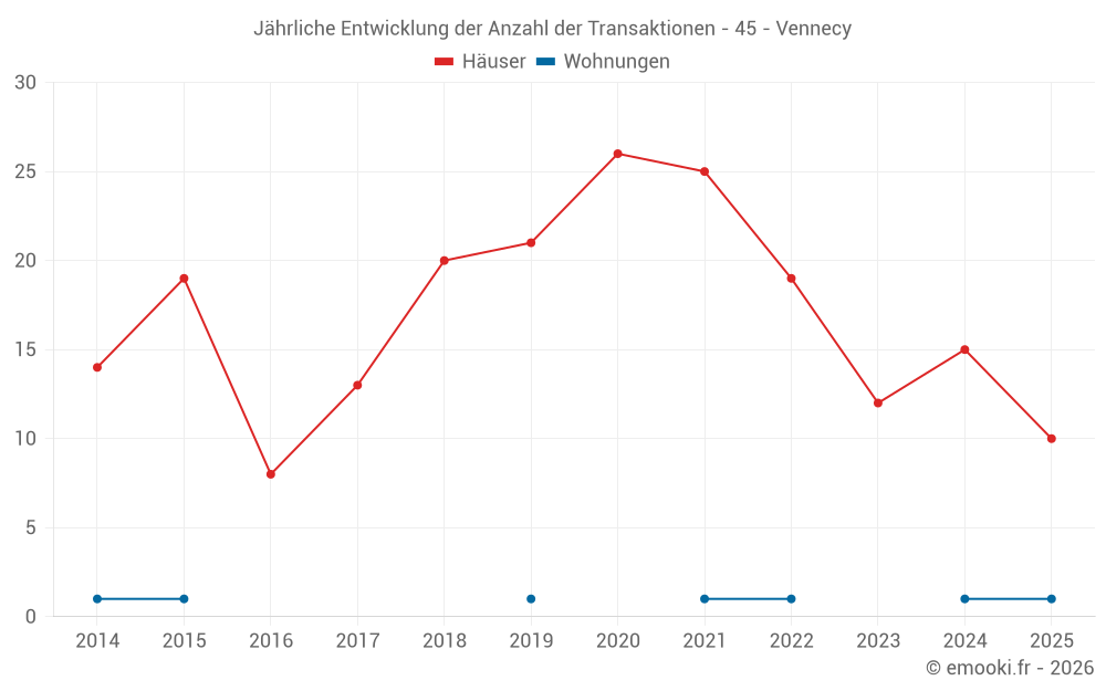 Der Durchschnittspreis auf den 19 Hausgeschäften der letzten 12 Monate in der Gemeinde Vennecy betrug 2 147 € pro Quadratmeter für einen mittleren Immobilienwert von 220 000 €. Über diesen Zeitraum hinweg lagen 60% der Transaktionen zwischen 1 874 und 2 404 € pro Quadratmeter (vom 2. bis zum 8. Dezil).