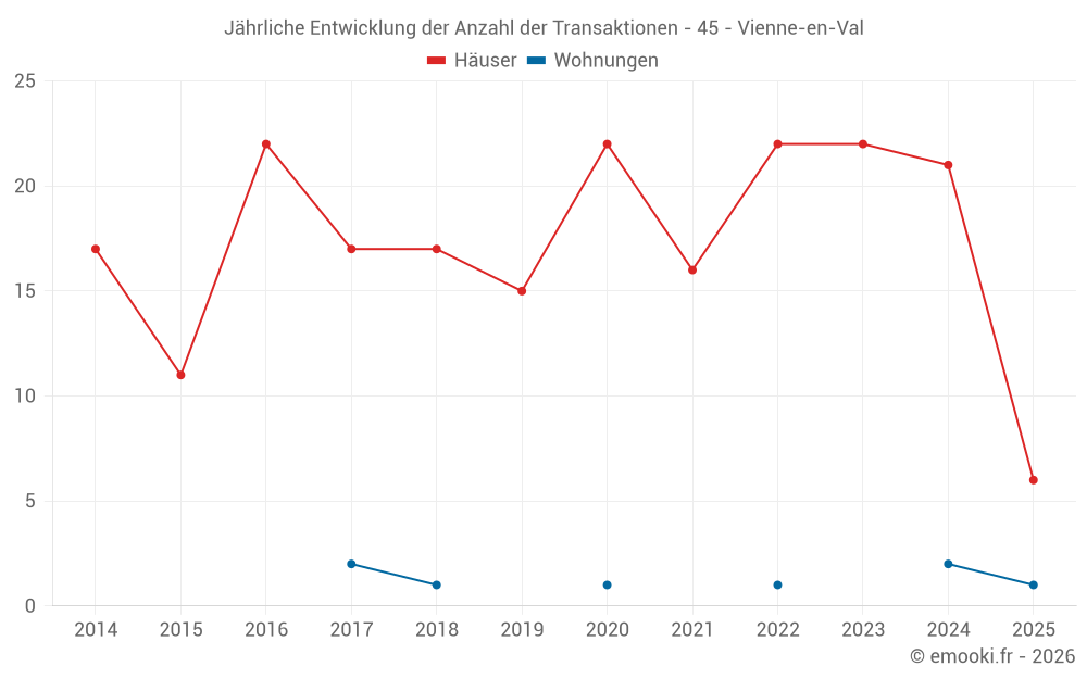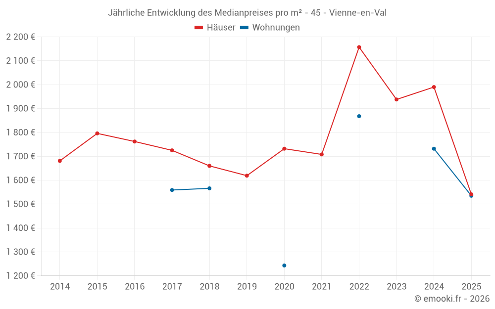 Der Durchschnittspreis auf den 21 Hausgeschäften der letzten 12 Monate in der Gemeinde Vienne-en-Val betrug 1 837 € pro Quadratmeter für einen mittleren Immobilienwert von 180 000 €. Über diesen Zeitraum hinweg lagen 60% der Transaktionen zwischen 1 386 und 2 325 € pro Quadratmeter (vom 2. bis zum 8. Dezil).