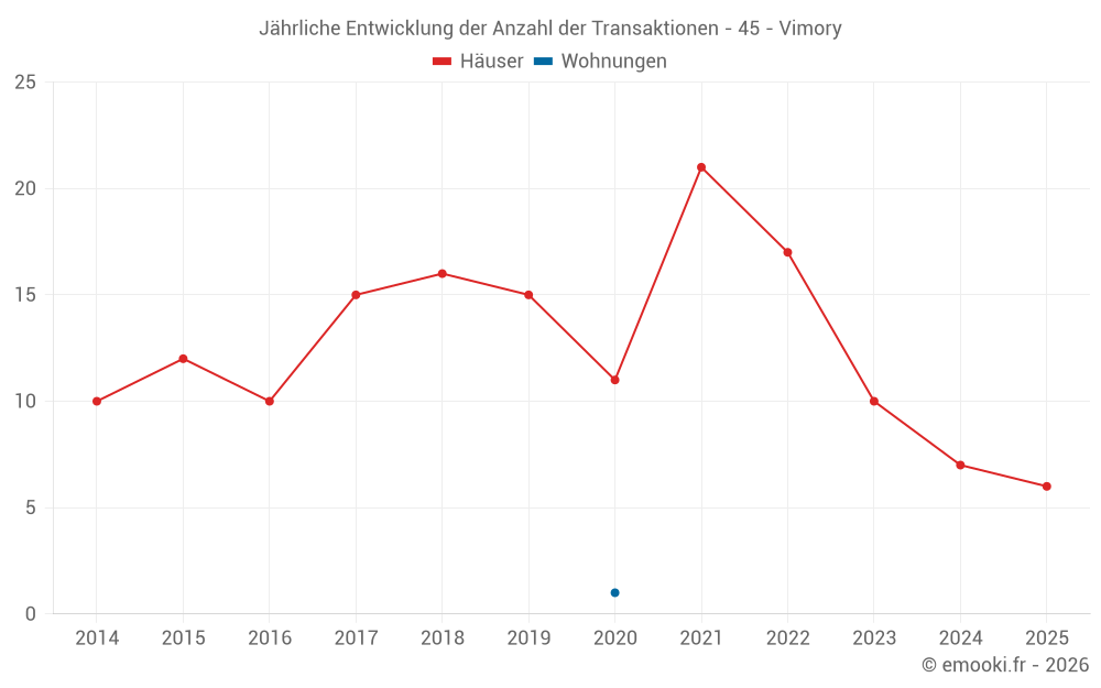 Der Durchschnittspreis auf den 20 Hausgeschäften der letzten 24 Monate in der Gemeinde Vimory betrug 1 572 € pro Quadratmeter für einen mittleren Immobilienwert von 171 720 €. Über diesen Zeitraum hinweg lagen 60% der Transaktionen zwischen 1 182 und 1 985 € pro Quadratmeter (vom 2. bis zum 8. Dezil).