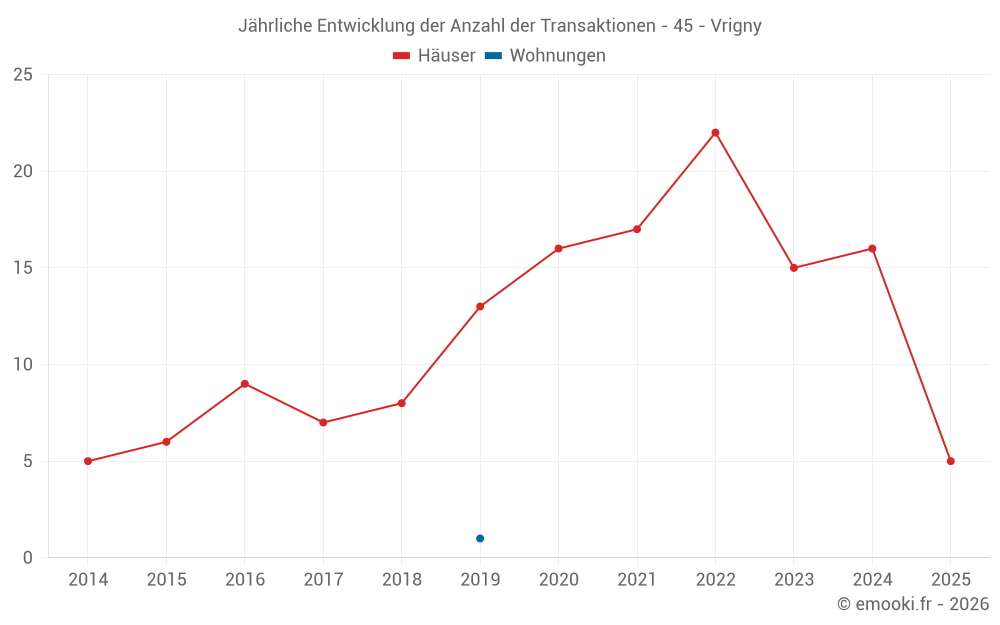 Der Durchschnittspreis auf den 28 Hausgeschäften der letzten 24 Monate in der Gemeinde Vrigny betrug 1 609 € pro Quadratmeter für einen mittleren Immobilienwert von 141 000 €. Über diesen Zeitraum hinweg lagen 60% der Transaktionen zwischen 1 287 und 1 894 € pro Quadratmeter (vom 2. bis zum 8. Dezil).