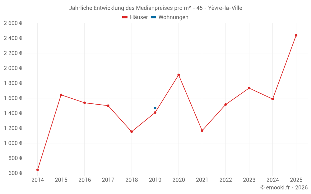 Der Durchschnittspreis auf den 14 Hausgeschäften der letzten 24 Monate in der Gemeinde Yèvre-la-Ville betrug 1 656 € pro Quadratmeter für einen mittleren Immobilienwert von 161 000 €. Über diesen Zeitraum hinweg lagen 60% der Transaktionen zwischen 812 und 2 203 € pro Quadratmeter (vom 2. bis zum 8. Dezil).