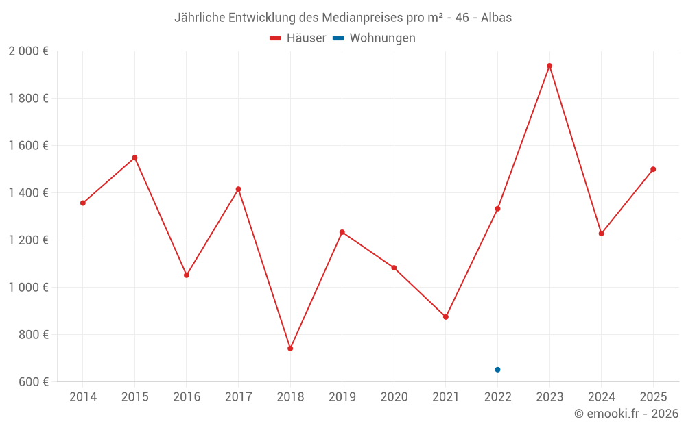 Der Durchschnittspreis auf den 19 Hausgeschäften der letzten 24 Monate in der Gemeinde Albas betrug 1 500 € pro Quadratmeter für einen mittleren Immobilienwert von 114 000 €. Über diesen Zeitraum hinweg lagen 60% der Transaktionen zwischen 755 und 2 150 € pro Quadratmeter (vom 2. bis zum 8. Dezil).