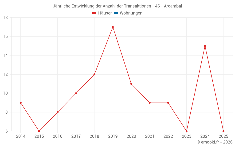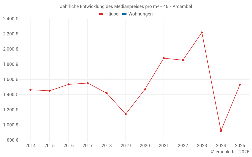 Der Durchschnittspreis auf den 16 Hausgeschäften der letzten 12 Monate in der Gemeinde Arcambal betrug 1 262 € pro Quadratmeter für einen mittleren Immobilienwert von 142 500 €. Über diesen Zeitraum hinweg lagen 60% der Transaktionen zwischen 781 und 1 863 € pro Quadratmeter (vom 2. bis zum 8. Dezil).